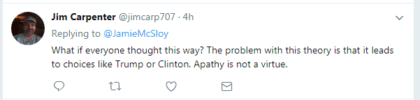 In my opinion – and I don’t like talking for other people – the guy above made a simple error of thinking. As a principled non-voter, (i.e. I’m not going to vote unless I believe in the candidate’s policies – all else be forgotten,) I’ve noticed this “error” a lot.