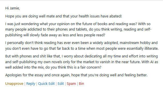 And let me answer this to start with: all of the things Rob talks about are fair concerns. We’ve got internet and phone addiction, we’ve got the economics of running a writing business, we’ve got the idea that reading is a niche hobby at the best of times, and we’ve got AI.